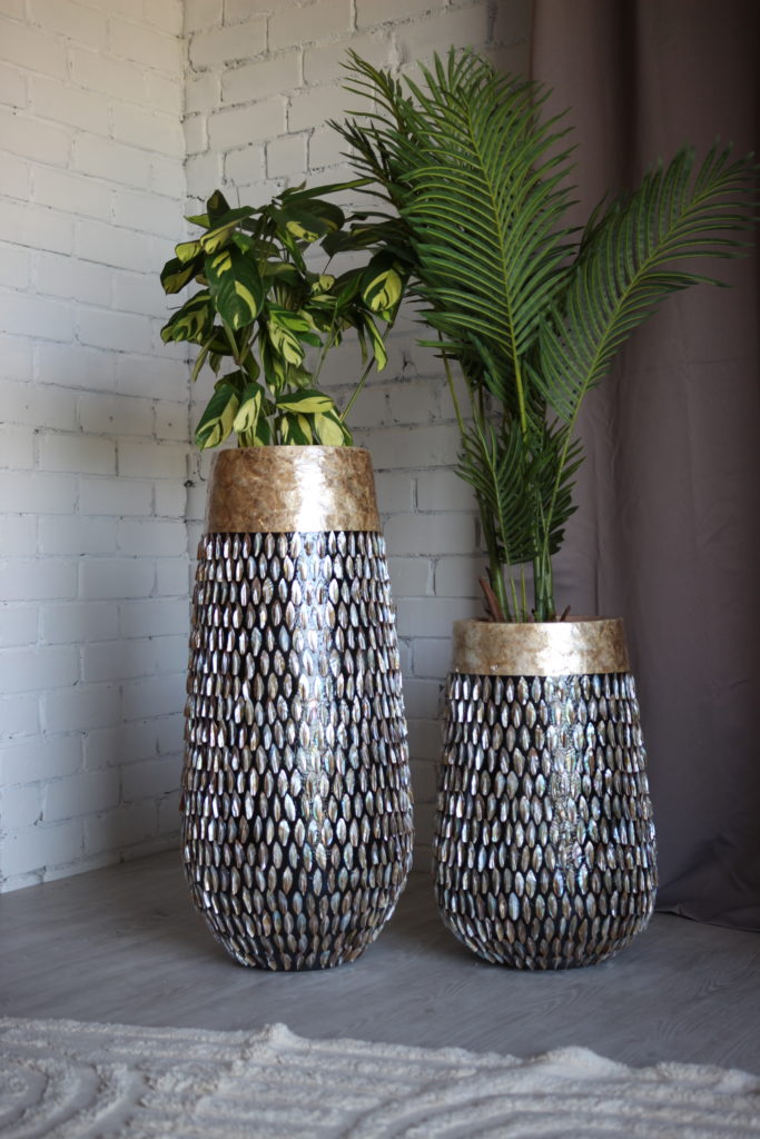 Šis išskirtinis didelis vidaus vazonas – daugiau nei interjero detalė. Jis sukurtas rankomis, o kiekviena jo dalelė papuošta autentiškomis jūros kriauklėmis, surinktomis rankomis iš pajūrio. Švelnus perlamutro žvilgesys ir natūralūs raštai suteikia vazono paviršiui subtilų prabangos ir gamtos harmonijos pojūtį.