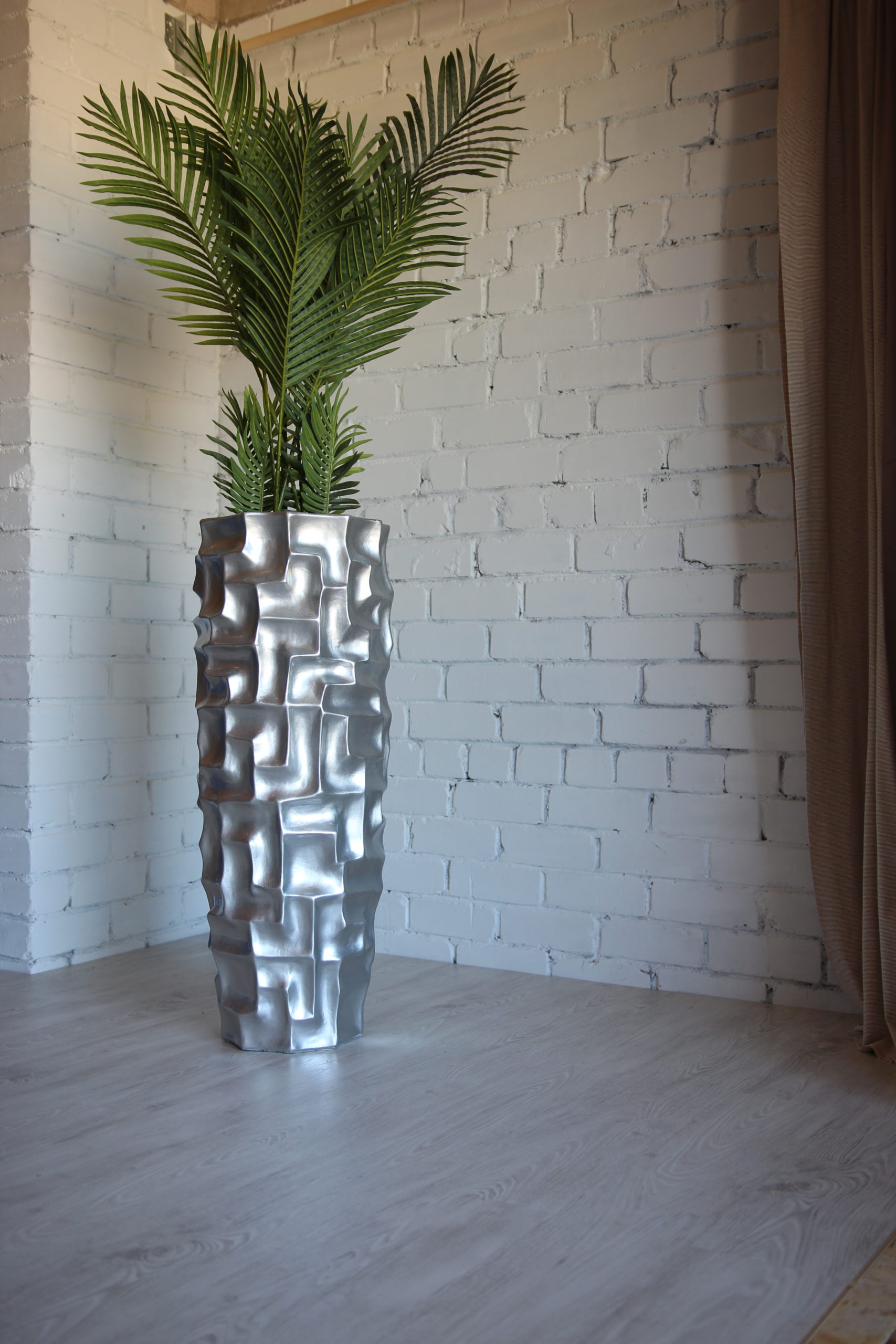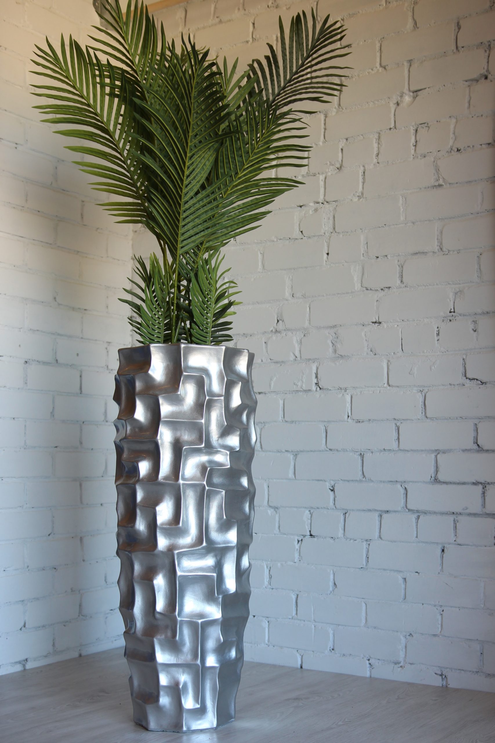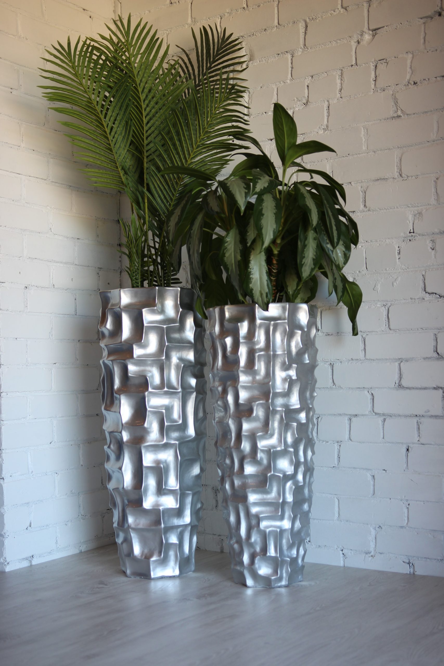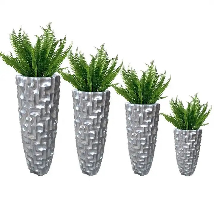 Universali spalva: sidabro spalvos aukšti vazonai yra lengvai priderinami tiek prie lauko kiemo dizaino, tiek prie kambario interjero.