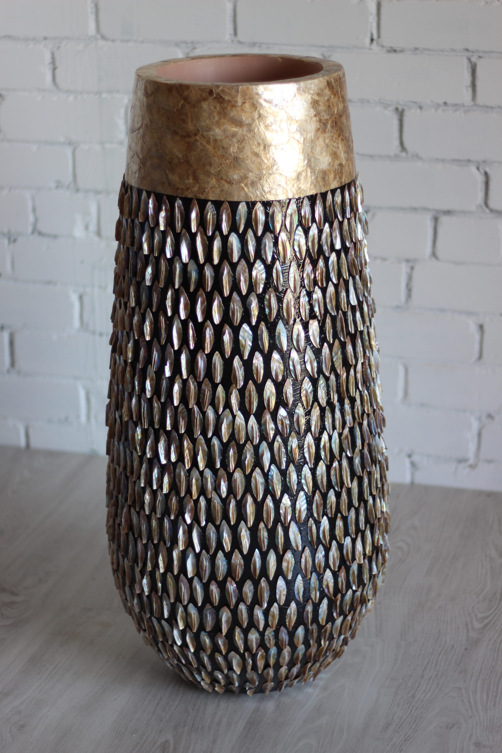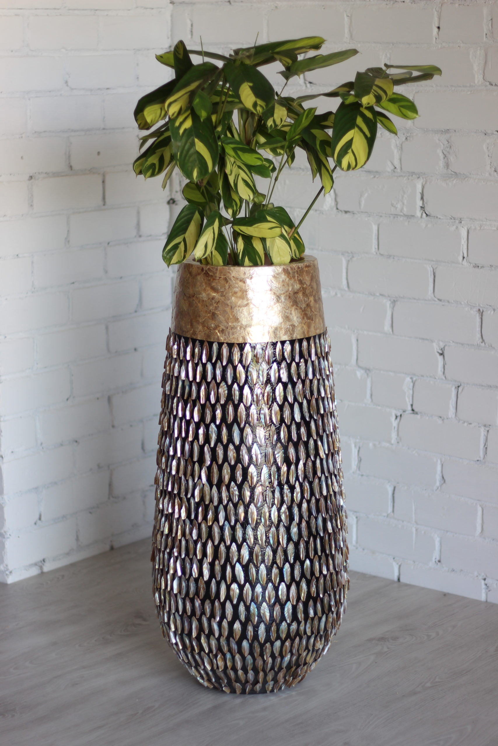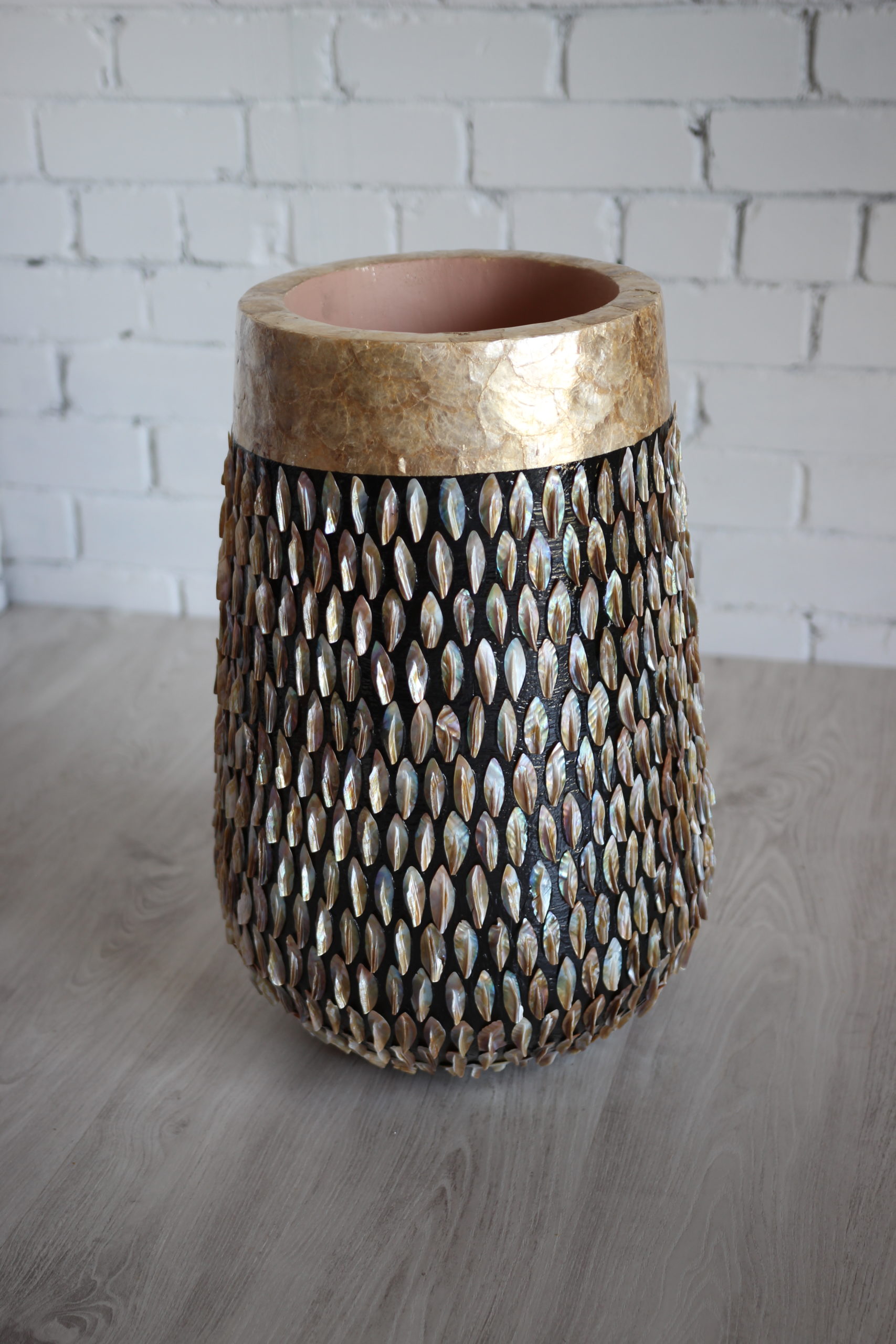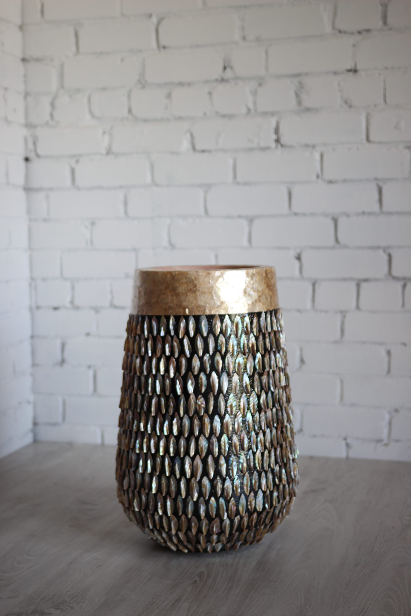 Rankų darbo: kiekvienas egzempliorius pagamintas atskirai, o kriauklės surinktos ir pritvirtintos rankomis – todėl kiekvienas vazonas tampa unikalus.