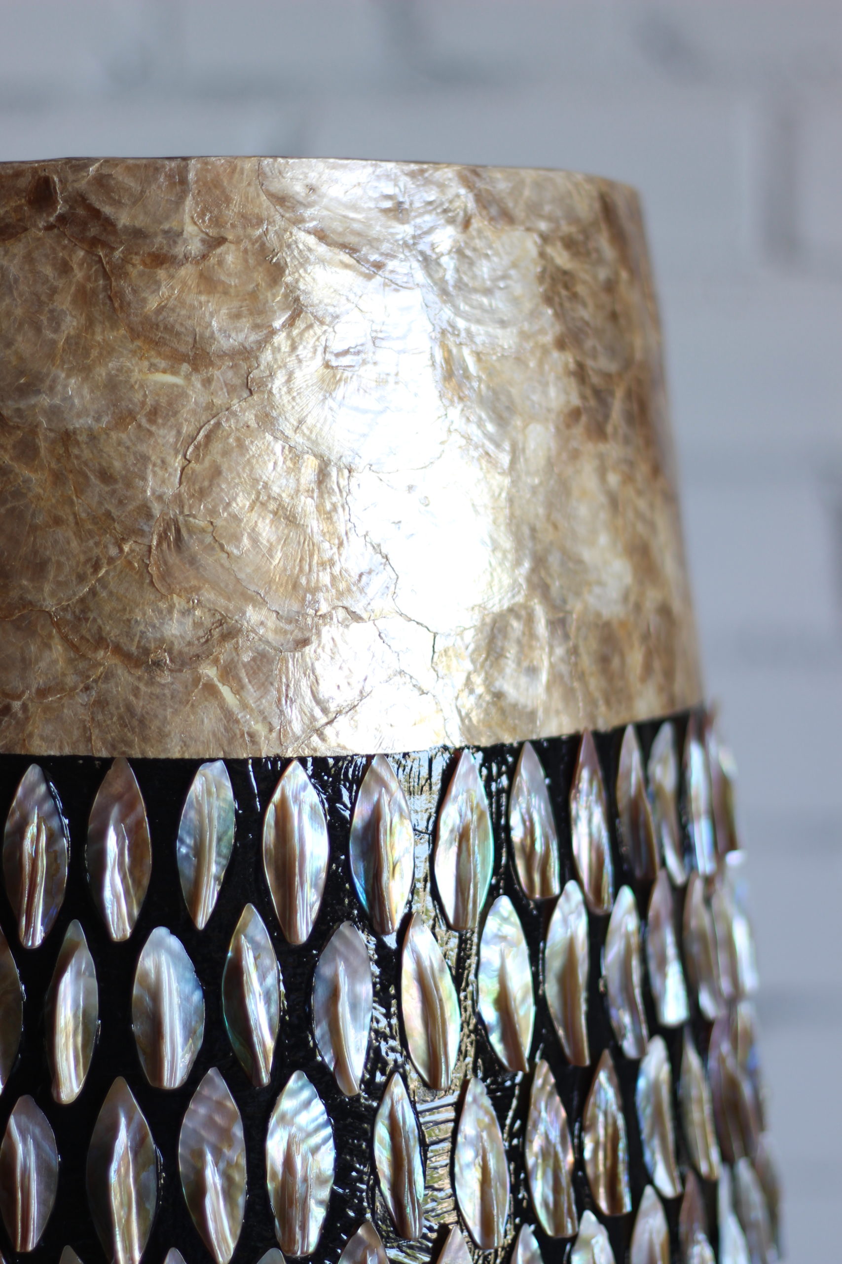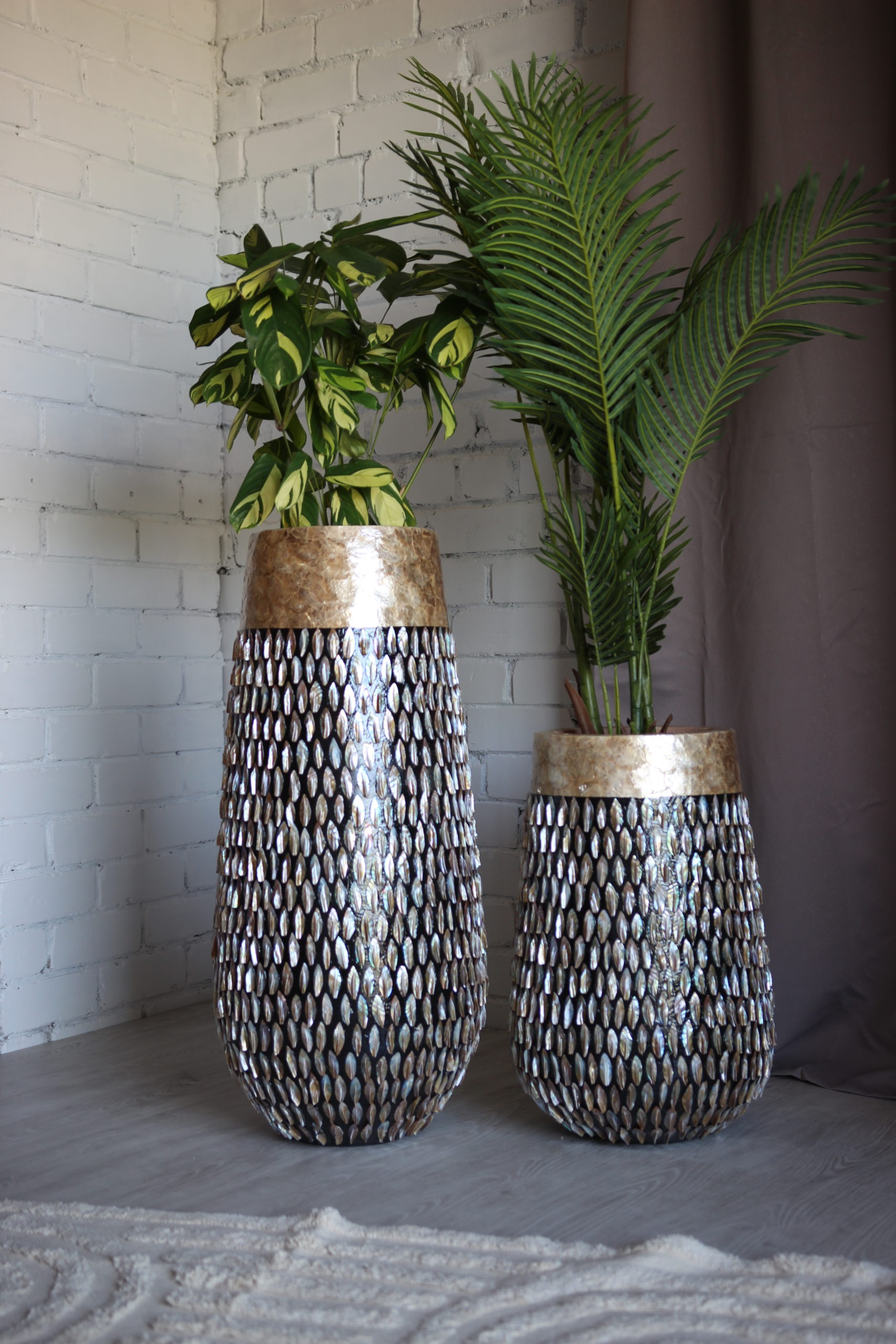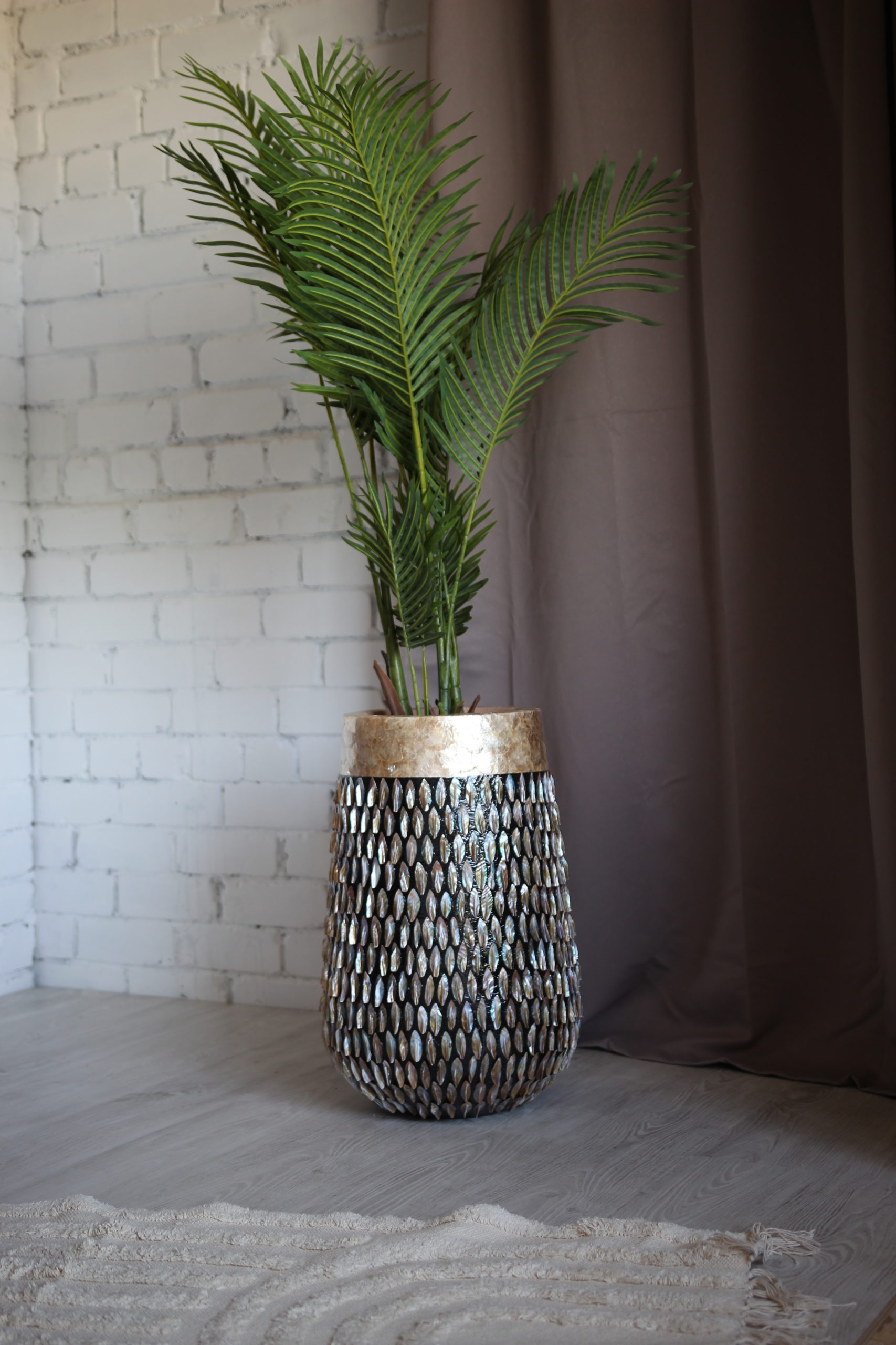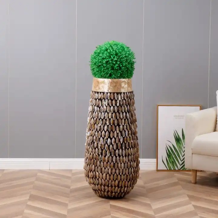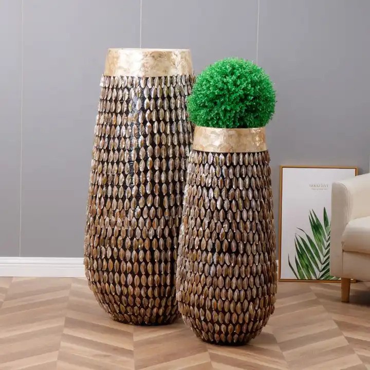 Rankų darbo: kiekvienas egzempliorius pagamintas atskirai, o kriauklės surinktos ir pritvirtintos rankomis – todėl kiekvienas vazonas tampa unikalus.