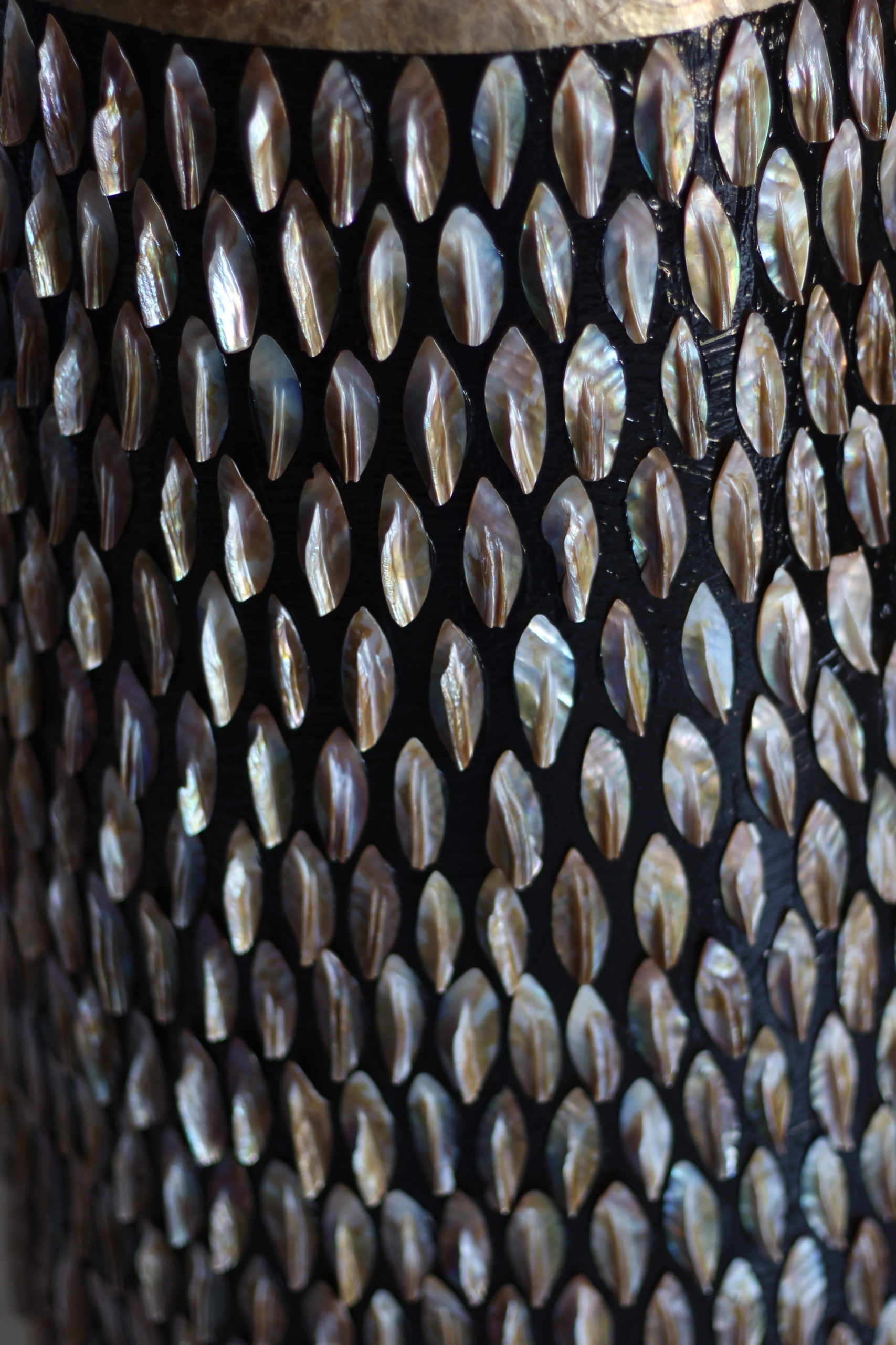Spalvų schema: juodas pagrindas + naturalių kriauklyčių mozaika.