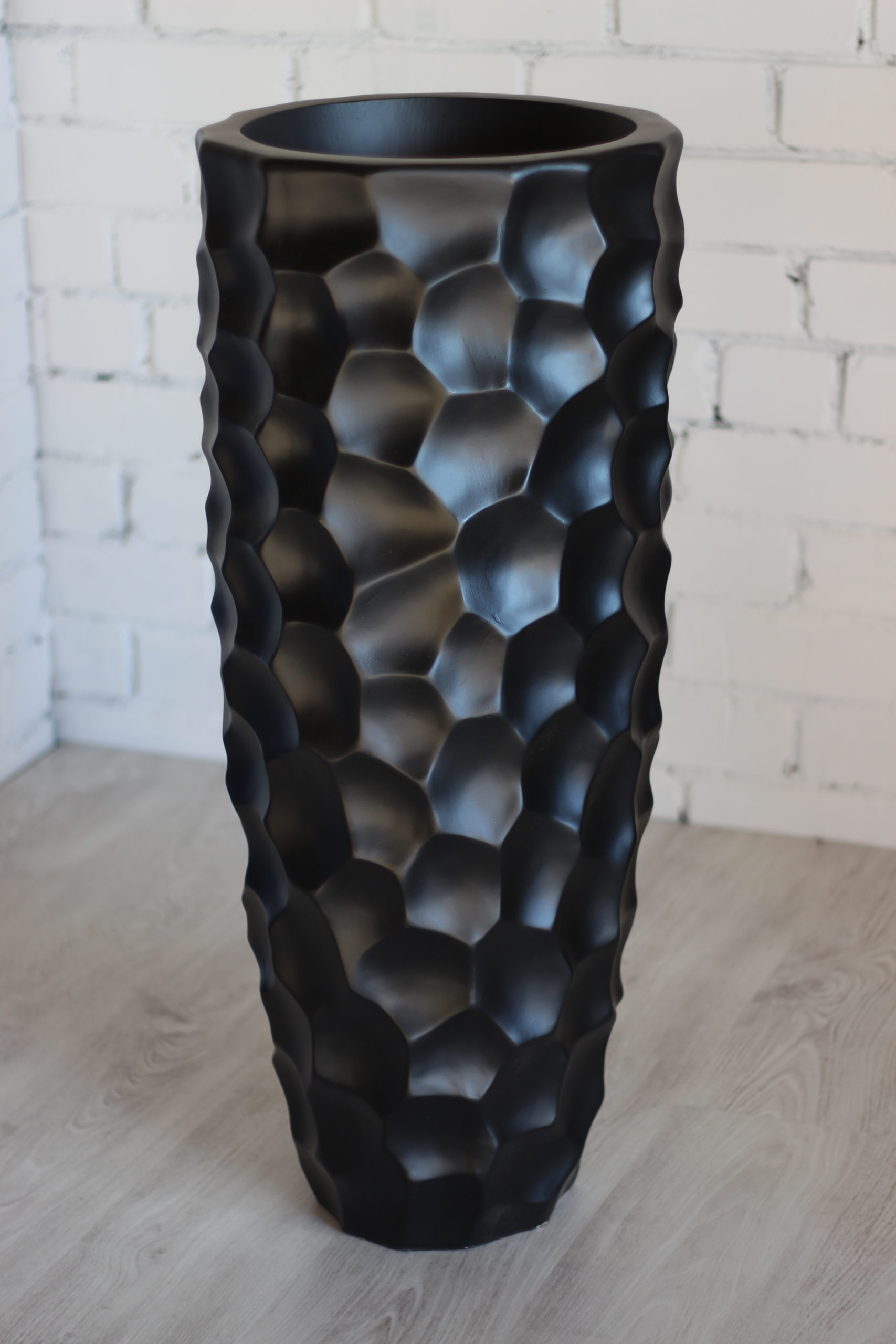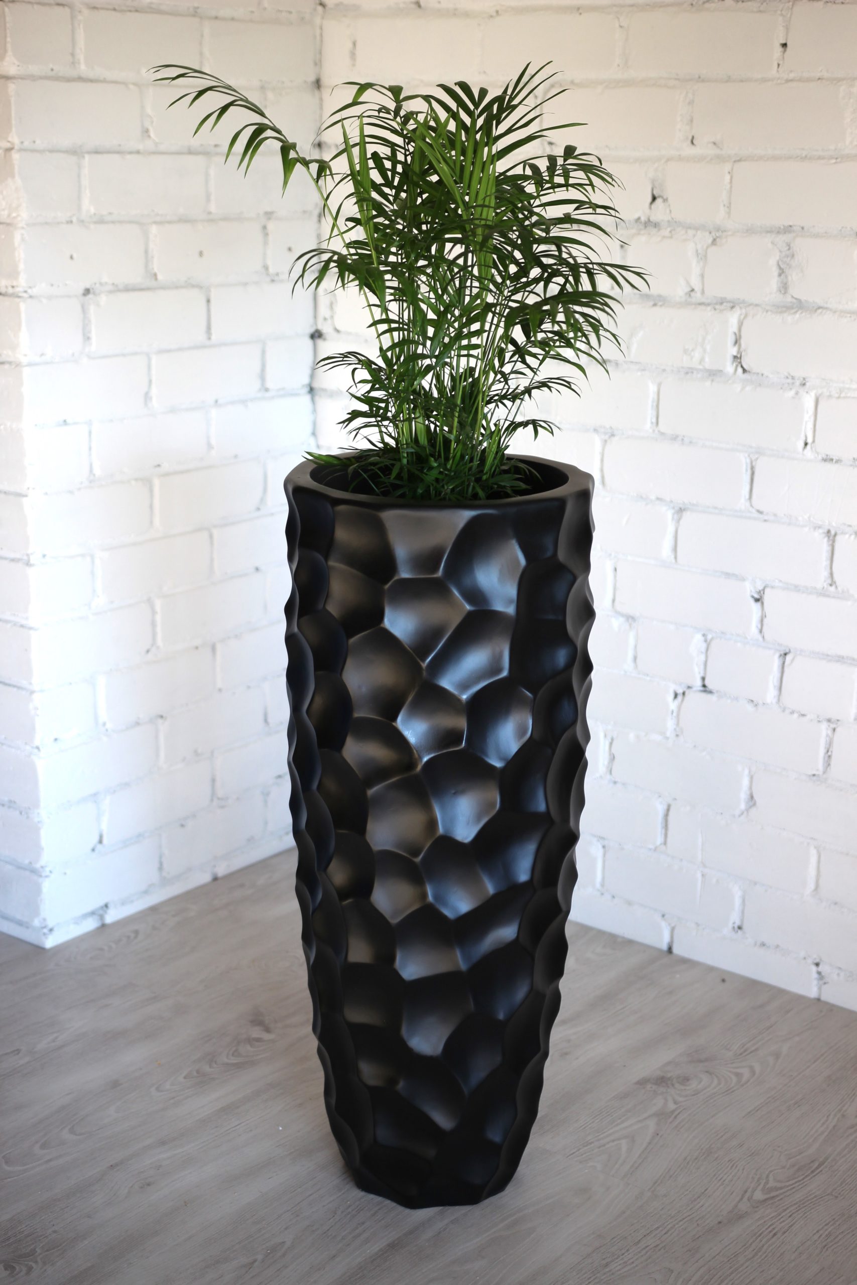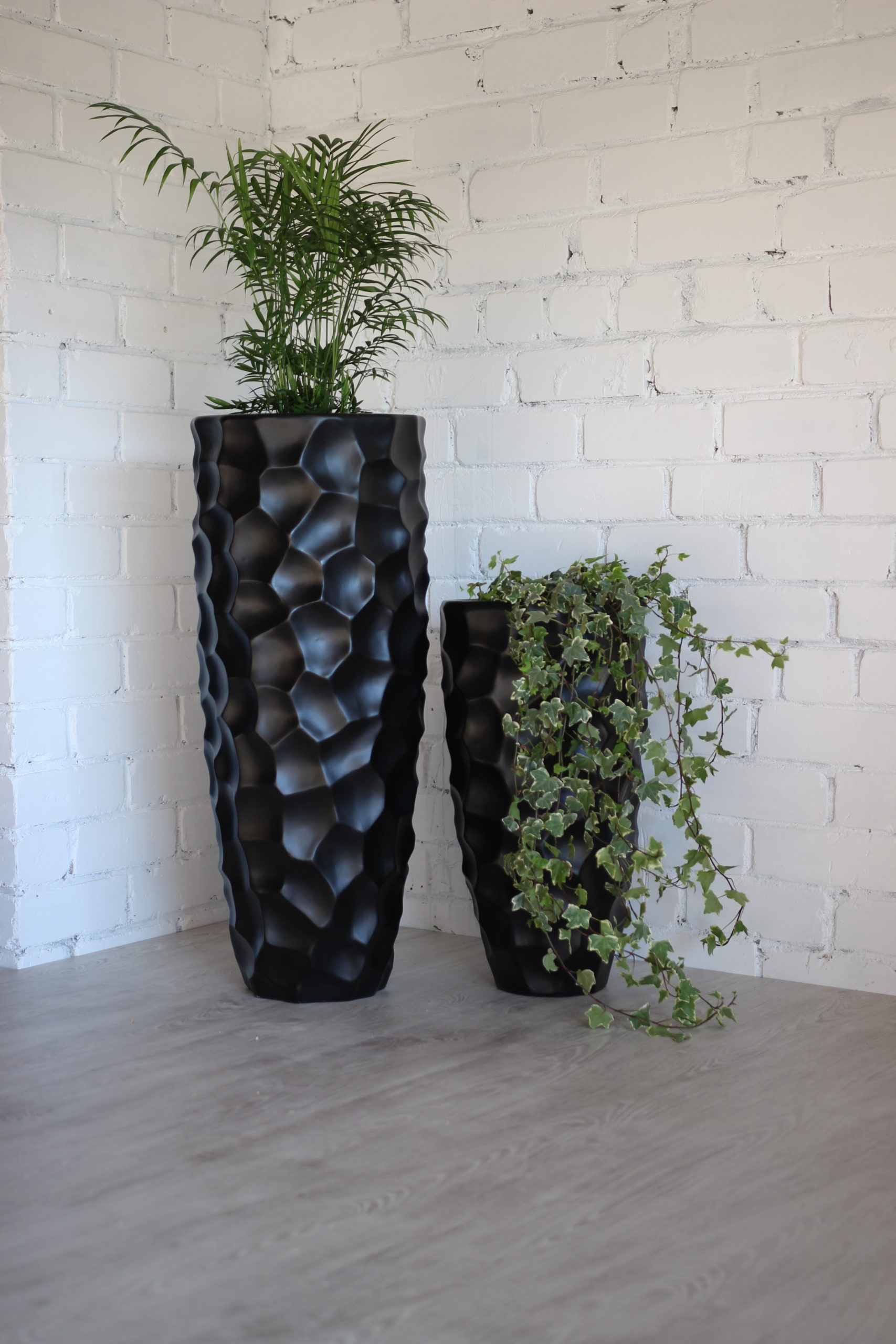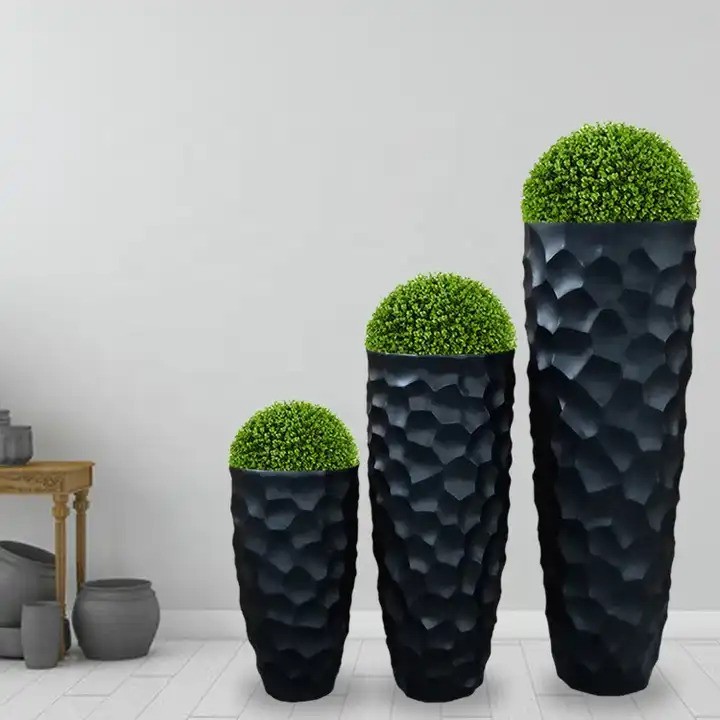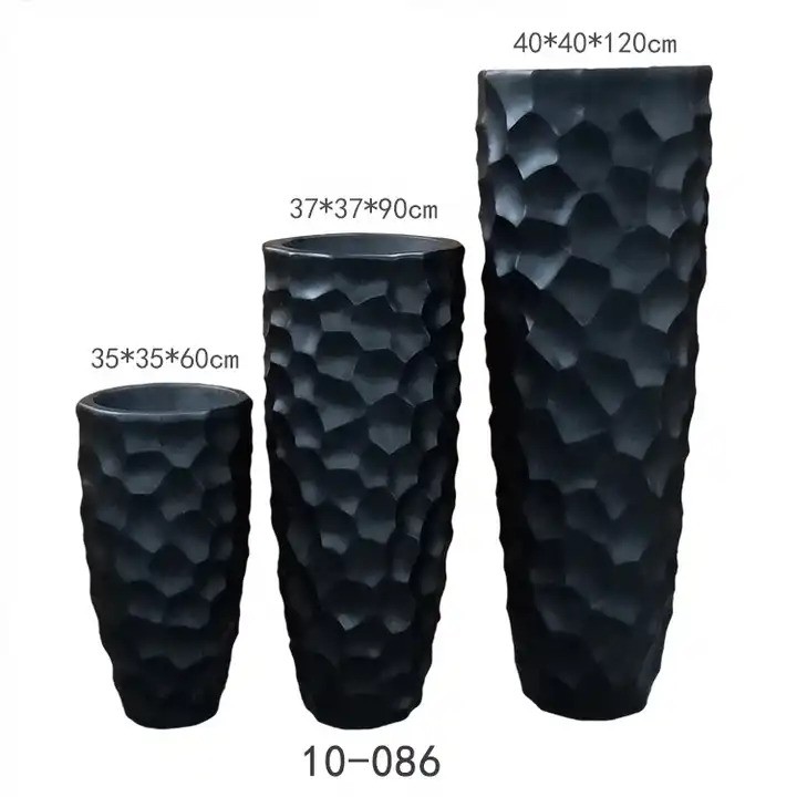 Puošnus dizainas: šis aukštas vazonas turi labai dailų dizainą. Vazono paviršius netolygus, gruoblėtas, su įdubimais. Juodos spalvos vazonai nesunkiai priderinami prie įvairių interjerų. Tinka naudoti namuose, prekybos vietose, biuruose, restoranuose, kavinėse ir viešbučių erdvėse. Taip pat gali būti naudojami norint papuošti erdvę šventėms.